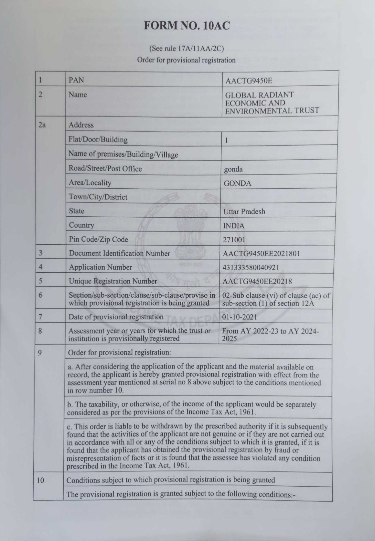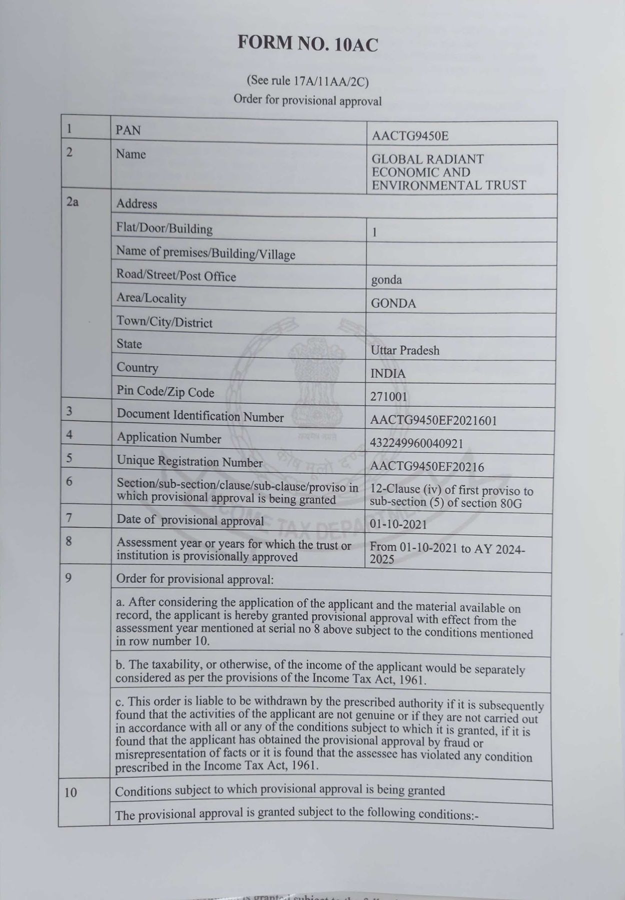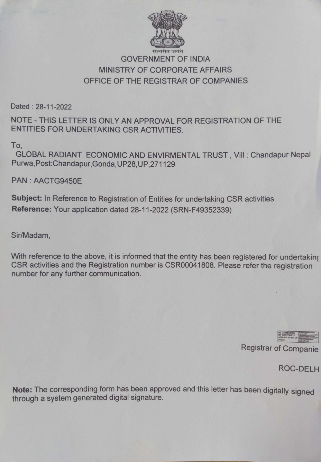 Document Gallery Global Radiant Economic and Environmental Trust 12AA Certificate 80G Certificate CSR Certificate Organisation pan